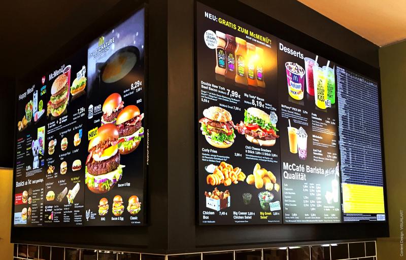 Đối với các quầy thức ăn nhanh như pizza, hamburger và các loại thức ăn đem đi kiểu take away, nếu không sử dụng thực đơn điện tử, các chuỗi cửa hàng này có thể dùng màn hình quảng cáo kỹ thuật số đặt tại quầy order. Trên các màn hình này trình chiếu thông tin menu với giá và hình ảnh món ăn, cùng với các chương trình ưu đãi đang diễn ra, vẫn đảm bảo được sự sinh động và tiện lợi. Các khách hàng sau có thể xem thông tin trên màn hình và suy nghĩ việc lựa chọn món nào trong khi khách hàng trước đang order món.